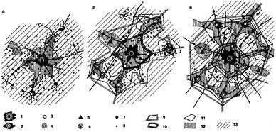 Рис.18. Принципиальная схема формирования средних и малых групповых систем населенных мест. Планировочная структура: А - современное состояние, В - первый этап формирования, В – перспектива. 1 – центр групповой системы; 2 – подцентры групповой системы в средних системах; 3 – опорные центры межселенного обслуживания; 4 – специализированные центры отдыха; 5- местные центры межселенного обслуживания сельского населения; 6 – прочие населенные пункты; 7 – границы групповой системы; 8- границы подсистем средней системы; 9 - зона преимущественного градостроительного развития; 10 – зона развития интенсивного пригородного сельского хозяйства; 11 – зона преимущественного сельскохозяйственного использования территории; 12 – зоны кратковременного отдыха; 13 – транспортные магистрали регионального значения.