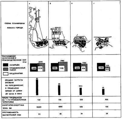 Рис. 30.Сравнительные показатели схем функционально-планировочной организации города на 180 тыс. жителей с различной производственной базой. а – на базе металлургического комплекса, б – на базе машиностроительного комплекса, в – на базе машиностроительного комплекса, г - на базе радиоэлектроники.