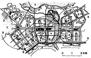 Рис. 31.Функционально-планировочная организация крупнейшего города 1 – промышленные районы, 2 –жилые районы, 3 – граница планировочных районов, 4 – территории общественных центров, 5 – системы городских магистралей и дорог, 7 – система зеленых насаждений и открытых пространств, 8 – основные направления связи с городами групповой системы населенных мест.
