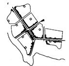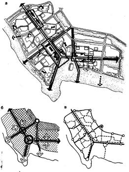 Рис.55.Формирование системы архитектурных ансамблей нового города. Единая композиционная система (а), определяющая архитектурную целостность города, формируется на основе ряда факторов. Архитектурно-ландшафтная оценка и композиционное зонирование территории (б) обусловили выявление прибрежной и глубинной композиционных зон для формирования глубинных перспектив; трех главных осей, на которых на которых размещаются три основных композиционных узла. Организация транспортных и пешеходных связей (в) размещение общественных центров и объектов общественного обслуживания (г) позволили упорядочить пространственно-планировочную организацию и размещение высотных акцентов.
