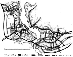 Рис. 57. Композиционное решение центральной части ГСНМ. Три развивающихся города, объединенных ориентацией на крупную реку системой связей и зеленых пространств, образуют общую композицию.