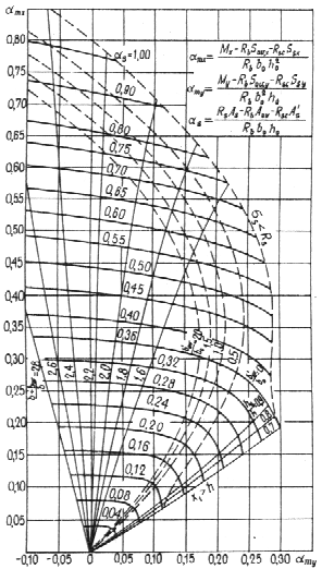 Если значение а на графике находится по левую сторону от кривой, отвечающей параметру подбор арматуры производится без учета косого изгиба, т. е. согласно пп. 3.18, 3.19 и 3.22, на действие момента М = Мx.