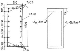 Расчет производим согласно п. 3.63. Принимая As 1, l = 491 мм2 (Æ 25), hl = 2 и As,tot = 6890 мм2 (8 Æ 28 + 4 Æ 25), находим площади арматуры Asl и Аst: