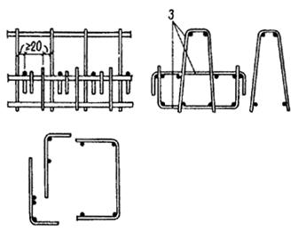 а — стержней внешних углов каркасов линейных конструкций; б ¾ промежуточных стержней каркасов линейных конструкций; в ¾ стержней узкой сетки со стержнями двух широких сеток для плоскостных конструкций; 1 ¾ сварочные клещи; 2 ¾ широкая сетка; 3 ¾ узкая сетка. При d1 + d2 £ 25 мм a = 60 мм, b = 100 мм; при 28 мм £ d1 + d2 £ 40 мм а = 75 мм, b = 120 мм 5.29. Пространственные каркасы для армирования линейных элементов (колонн, свай, балок и т. п.) рекомендуется изготовлять с применением контактной точечной сварки следующими способами: а) соединением плоских сеток отдельными стержнями, привариваемыми к продольным стержням сеток с помощью сварочных клещей (черт. 99, а) в соответствии с п. 5.28; б) соединением гнутых сеток стержнями (черт. 99, б), привариваемыми, как указано выше; в) навивкой спиральной поперечной арматуры на продольную арматуру (черт. 99, в) со сваркой в процессе навивки всех пересечений с помощью сварочных клещей. Такие каркасы рекомендуются для армирования труб, свай, бесконсольных колонн и других изделий массового изготовления; г) нанизыванием на продольные стержни хомутов, заранее согнутых и сваренных контактной точечной сваркой в местах пересечения ветвей,с последующей сваркой клещами всех пересечений (черт. 99, г). Места пересечения ветвей хомутов размещаются по длине каркаса вразбежку. Такие каркасы могут применяться, в частности, для армирования колонн с промежуточными консолями. При отсутствии сварочных клещей может производиться вязка соединений продольных стержней и хомутов (в этом случае рекомендуется обеспечивать пространственную жесткость каркасов приваркой дополнительных стержней, планок и т. п.); д) сгибанием плоской сетки до получения замкнутого контура и последующей сваркой клещами поперечных стержней с продольным стержнем противоположного края исходной сетки (черт. 99, д). Этот способ рекомендуется при наличии специального оборудования или приспособлений; е) сваркой клещами четырех плоских сварных сеток (черт. 99, е). Этот способ может быть применен, в частности, при изготовлении каркасов колонн, когда расстояние между угловыми и средними стержнями менее 75 мм, а число продольных стержней не менее восьми; ж) соединением двух сеток монтажными стержнями, перпендикулярными плоскости изгиба и привариваемыми к поперечной арматуре сеток (черт. 99, ж). Этот способ допускается в балках, не работающих на кручение, и в колоннах при общем насыщении продольной арматурой не более 3 %; з) соединением нескольких гнутых и плоских сеток стержнями, привариваемыми клещами (черт. 99, и); и) из двух диагонально расположенных плоских сеток, выполняемых с помощью сварки одноточечными машинами продольных стержней сразу обеих сеток со своими поперечными стержнями (черт. 99, к), при этом должна быть обеспечена монтажная жесткость каркаса приваркой стержней, планок и т. п. Способ допускается для стоек, свай и т. п. при насыщении продольной арматурой до 1 %. а)