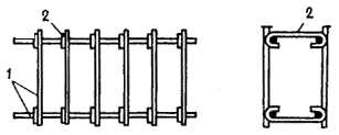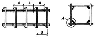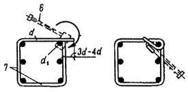а ¾ из двух сеток и соединительных стержней, привариваемых к продольной арматуре сеток; б ¾ из гнутых сеток и соединительных стержней; в ¾ с навивкой спиральной поперечной арматуры на продольную арматуру; г ¾ из ранее согнутых и сваренных хомутов, нанизанных на продольные стержни; д ¾ из сетки, согнутой до получения замкнутого контура; е — из четырех плоских сеток; ж — из двух сеток и монтажных стержней, перпендикулярных плоскости изгиба и привариваемых к поперечной арматуре сеток (в балках, не работающих на кручение, и в колоннах при общем насыщении продольной арматурой не более 3 %); и ¾ пространственный каркас из нескольких гнутых и плоских сеток и соединительных стержней, привариваемых с помощью сварочных клещей; к ¾ пространственные каркасы при насыщении продольной арматурой до 1 % в виде двух диагонально расположенных плоских сеток; 1 ¾ плоская сетка; 2 ¾ соединительный стержень; 3 ¾ гнутая сетка; 4 ¾ точечная сварка 5.30. Пространственные каркасы линейных элементов могут быть изготовлены без применения контактной точечной сварки следующими способами: а) соединением сеток с помощью скоб и дуговой сваркой их с хомутами (черт. 100, а). В колоннах, в балках, работающих на кручение, а также в сжатой зоне балок с учитываемой в расчете сжатой арматурой длина односторонних сварных швов l должна быть не менее 6 d (где d ¾ диаметр хомута), а монтажных соединений — 3 d; б) соединением плоских сеток с помощью шпилек с вязкой всех пересечений (черт. 100, б), при этом должна быть обеспечена монтажная жесткость каркаса приваркой стержней, планок и т. п.; в) соединением плоских сеток между собой с помощью дуговой сварки продольных стержней (черт. 100, в) возле всех мест приварки хомутов. Длина швов l должна быть не менее 5 d (где d —диаметр хомутов). Такие соединения допускаются при насыщении сечения сжатой арматурой не более 3 %; г) из продольных стержней и гнутых хомутов с вязкой пересечений (черт. 100, г) и присоединением элементов жесткости (вязаные каркасы); д) из одной или нескольких гнутых или плоских сеток и соединительных стержней диаметрами не более 6 мм огибанием продольных стержней сеток концами соединительных стержней с образованием замкнутой петли с помощью гибочных ключей (черт. 100, д). Способ рекомендуется при наличии специальных кондукторов, обеспечивающих надежную фиксацию каркасов. При наличии сжатых продольных стержней требования к расстояниям между соединительными стержнями такие же, как к расстояниям между сварными хомутами (см. п. 5.59). а)