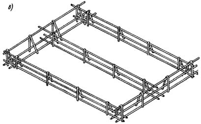 а — из двух плоских сеток и скоб, привариваемых к поперечной арматуре сеток; б ¾ из двух плоских сеток, соединяющихся с помощью шпипек, с вязкой всех пересечений; в ¾ из четырех плоских сеток; г ¾ из продольных стержней и гнутых хомутов с вязкой пересечений; д ¾ каркас, образуемый из одной или нескольких гнутых или плоских сеток и соединительных стержней с помощью гибочных ключей; 1 ¾ плоская сетка; 2 ¾ скоба или шпилька; 3 ¾ поперечные стержни плоских сеток; 4 —продольные стержни плоских сеток; 5 ¾ дуговая сварка; 6 ¾ гибочный ключ; 7 ¾ гнутая сетка Из-за большой трудоемкости каркасы, приведенные в настоящем пункте, могут применяться лишь в виде исключения или при отсутствии сварочных клещей. 5.31. Пространственные каркасы для армирования плоских элементов (плит, стеновых панелей и т. п.) рекомендуется изготовлять следующими способами: а) соединением плоских сеток типа «лесенка» стержнями, привариваемыми клещами (черт. 101, а); б) соединением сеток типа «лесенка» одного направления такими же плоскими сетками другого направления и меньшей высоты (черт. 101, б). Соединения пересечений осуществляются клещами; при их отсутствии допускается вязка. Для обеспечения устойчивости при сборке в обоих указанных случаях плоские сетки типа «лесенка» могут быть заменены гнутыми V-образными сетками (черт. 101, в). Пространственный каркас ребристых плит или панелей изготовляется из гнутых корытообразных сеток с приваркой или привязкой к ним плоских сеток типа «лесенка».