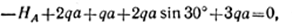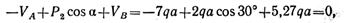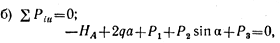 где Р2 cos α — вертикальная составляющая силы Р2; P2 sin α — горизонтальная составляющая силы Р2; 2qa — равнодействующая равномерно распределенной нагрузки интенсивностью q (показана штриховой линией);