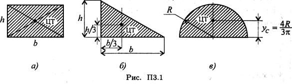 Основные формулы и предпосылки расчета Тема 1.6. Центр тяжести Практическое занятие 3. Центр тяжести. Знать методы определения центра тяжести тела и плоских сечений, формулы для определения положения ЦТ плоских сечений. Уметь определять положение центра тяжести сложных геометрических фигур, определять положение центра тяжести фигур, составленных из стандартных профилей. Центры тяжести простейших сечений (рис. П3.1)