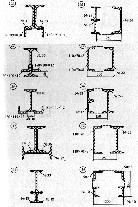 Задание 2. Определить координаты центра тяжести составного сечения. Сечения состоят из листов с поперечными размерами а х 6 и прокатных профилей по ГОСТ 8239-89, ГОСТ 8240-89 и ГОСТ 8509-86. Уголок выбирается наименьшей толщины. Размеры стандартных профилей в Приложении 1.