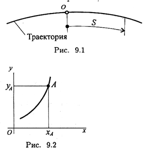 Положение точки в каждый момент времени можно определить по расстоянию, пройденному вдоль траектории от некоторой неподвижной точки, рассматриваемой как начало отсчета (рис. 9.1). Такой способ задания движения называется естественным. Таким образом, уравнение движения можно представить в виде S = f(t). Положение точки можно также определить, если известны ее координаты в зависимости от времени (рис. 9.2). Тогда в случае движения на плоскости должны быть заданы два уравнения: