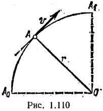 5. Проводим в точке А (середину дуги A0A1) касательную к траектории и изобразим вектор скорости v (рис. 1.110). Скорость точки в конце траектории (в положении A1) рекомендуется найти самостоятельно. (Ответ: 17,8 м/с.)