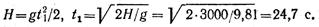 Пример 8. В шахту глубиной H = 3000 м с поверхности земли без начальной скорости брошен предмет. Определить, через сколько секунд звук, возникающий в момент удара предмета о дно шахты, достигнет поверхности земли. Скорость звука 333 м/с. Уравнение движения свободно падающего тела