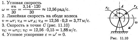 2. Определяем время до полной остановки. Скорость при остановке равна нулю, ω = 0. Таким образом, ω = ω0 + et 0 = ω0 + et Тогда t0CT = -ω0/ε tocr = 40π*3/π = 120 c. Пример 5. Маховое колесо вращается равномерно со скоростью 120 об/мин (рис. 11.10). Радиус колеса 0,3 м. Определить скорость и полное ускорение точек на ободе колеса, а также скорость точки, находящейся на расстоянии 0,15 м от центра.