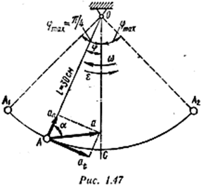 Направления ω и ε показаны на рис. 1.47. В приведенном примере направления ω и ε противоположны. Следовательно, стержень OA совершает замедленное вращательное движение. Нормальное и касательное ускорения шарика определяются по формулам: