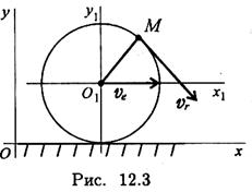 Скорость точки М vM = ve + vr, ve — скорость центра колеса переносная; vr — скорость вокруг центра относительная. уОх — неподвижная система координат, y101x1 — подвижная система координат, связанная с осью колеса.