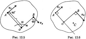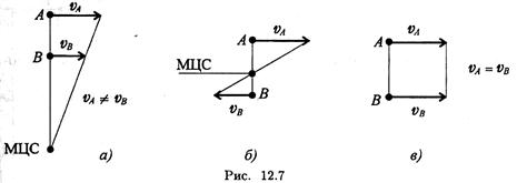 Соединяем концы векторов, МЦС находится на пересечении линии, соединяющей концы векторов с линией АВ (рис. 12.7). При поступательном движении тела (рис. 12.7в) МЦС отсутствует.