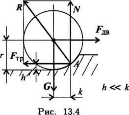 Обычно считают грунт мягче колеса, тогда в основном деформируется грунт, и в каждый момент колесо должно перекатываться через выступ грунта. Для равномерного качения колеса необходимо прикладывать силу FДВ (рис. 13.4). Условие качения колеса состоит в том, что движущийся момент должен быть не меньше момента сопротивления: