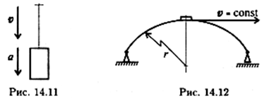 7. Автомобиль въезжает на арочный мост с постоянной скоростью v (рис. 14.12). Нанесите силы, действующие на автомобиль в середине моста, используя принцип кинетостатики, запишите уравнения равновесия.