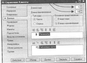 Все подряд свойства объекта конфигурации Справочник мы пока настраивать не будем, нас вполне удовлетворят те значения, которые система предлагает для них по умолчанию. Поэтому три раза нажмем «Далее» и окажемся на закладке «Данные». Здесь для нас представляют интерес длина кода и длина наименования. Длина кода - важное свойство справочника. Как правило, код справочника используется для идентификации элементов справочника и содержит уникальные для каждого элемента справочника значения. Платформа может сама контролировать уникальность кодов и поддерживать автоматическую нумерацию элементов справочника. Уникальность кодов платформа может отслеживать сама, поэтому от длины кода будет зависеть количество элементов, которые могут содержаться в справочнике. Длина кода 5 символов - это от 0 до 99999, то есть сто тысяч элементов. Для нашего небольшого OOO «На все руки мастер» этого вполне достаточно.