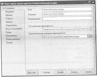 бъект конфигурации План видов характеристик является прикладным объектом и предназначен для описания структуры хранения информации о характеристиках, создаваемых пользователем. На основе объекта конфигурации План видов характеристик платформа создает в базе данных информационную структуру, в которой может храниться информация о том, какие существуют виды характеристик и какой тип должно иметь значение характеристики каждого вида. В сущности, план видов характеристик очень напоминает справочник. Однако план видов характеристик имеет более узкую «специализацию»: он хранит, по сути, информацию только о том, какими видами характеристик может описываться какой-либо объект базы данных. Эта информация состоит из названия вида характеристики и ее типа. Разработчик и, что самое важное, пользователь могут задать в нем любое необходимое им количество видов характеристик. Для того чтобы разработчик мог задать некий «набор» возможных типов значений, которые могут принимать виды характеристик, у объекта конфигурации План видов характеристик существует свойство Тип значения характеристик. Это свойство определяет составной тип данных, в который входят все типы, которые могут понадобиться при указании типа значения характеристики. Кроме этого может случиться так, что пользователю станет недостаточно тех типов данных, которые существуют в конкретной системе (например, он захочет вести учет в разрезе цвета товаров, а справочник Цвет в конфигурации отсутствует). В этом случае он сможет воспользоваться неким вспомогательным справочником, который разработчик создаст заблаговременно и укажет в качестве свойства объекта конфигурации План видов характеристик - дополнительные значения характеристик. Тогда пользователь, создав новый вид характеристики «Цвет», Примечательно, что этот справочник является подчиненным плану видов характеристик. Таким образом, если затем пользователь пожелает создать новый вид характеристик «Запах» и создать его значения, он будет создавать их в том же самом справочнике дополнительных характеристик, и они не будут «смешиваться» со значениями цвета. %Для тех, ктоработал с версией 7.7. В версии 7.7 нет прямого соответствия прикладному объекту конфигурации план видов характеристик. Точнее всего будет сказать, что один план видов характеристик включает в себя me функциональные возможности, которыми в версии 7.7 обладали все объекты конфигурации вида «Вид субконто». Таким образом, в терминах 7.7, планы видов характеристик позволяют создавать несколько «наборов» объектов «Вид субконто». Однако описание механизма ведения аналитического учета на счетах не является теперь основной задачей для плана видов характеристик. Использование подобного механизма было обобщено в виде возможности задания переменного количества свойств, которые могут описывать объект конфигурации. Причем возможность задания свойств существует как в режиме Конфигуратора, так и в режимеработы пользователя «1С:Предприятие». Работа с планом счетов рассматривается теперь не как основное предназначение плана видов характеристик, а как частный случай, вытекающий из его возможностей. Конечно, как мы увидим далее, взаимодействие плана видов характеристик с планом счетов максимально автоматизировано средствами платформы (no сравнению 