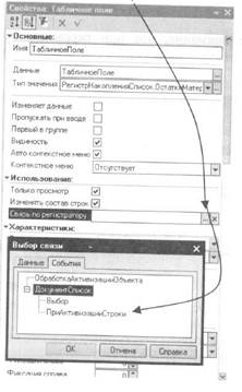 Таким образом мы определили, какие данные будут содержаться в нижнем списке, осталось только установить между двумя списками связь таким образом, чтобы при изменении выбранного элемента в верхнем списке, содержимое нижнего списка менялось соответствующим образом. Для этого откроем палитру свойств добавленного нами табличного поля и воспользуемся свойством «Связь по регистратору». Связь по регистратору мы будем устанавливать с обработчиком события «При активизации строки» верхнего поля «ДокументСписок»: Установим связь по регистратору... \