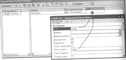 еобходимость вывода произвольных данных в колонках списка возникает, когда вместе с элементом списка нужно отобразить некоторую вычисляемую информацию. Мы рассмотрим эту ситуацию на примере отображения актуальной цены в списке справочника «Номенклатура». Откроем в конфигураторе форму списка справочника «Номенклатура» (или, если ее нет, создадим основную форму списка). Воспользуемся контекстным меню правой кнопки мыши и добавим в табличное поле колонку с именем и текстом шапки «Цена»: В табличное поле списка справочника Номенклатура добавим колонку Цена...