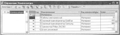 Первое, что мы делаем в этом обработчике - проверяем, что выводимый элемент справочника не является группой. В этом случае мы создаем вспомогательную структуру для описания отбора («ОтборНоменклатуры») и помещаем в ячейку «Цена» актуальное значение цены, полученной из периодического регистра сведений «Цены». Затем мы анализируем значение выведенной цены и если оно находится в нижнем ценовом диапазоне (менее 500 рублей), выделяем это значение васильковым цветом. Для указания цвета мы используем системный набор значений WEBL4BeTa. Запустим 1С:Предприятие в режиме отладки и посмотрим, какой внешний вид примет теперь справочник «Номенклатура»: