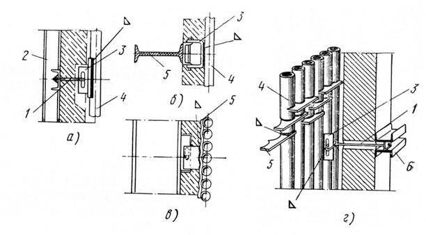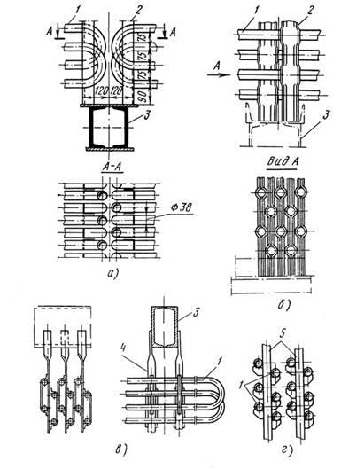 Рис. 2.18. Крепление змеевиков водяных экономайзеров на стойках из уголков (а), штампованных полос (б), на подвесках из полос (в) и труб (г): 1 – труба змеевика, 2 – стойка, 3 – опорная балка, 4, 5 – подвески из полос и труб. Восстановление и замену поврежденных стоек и подвесок экономайзера выполняют после демонтажа змеевиков. Во время ремонта котла без замены змеевиков все стойки и подвески тщательно проверяют. Выявленные разрывы по сварке, отрывы от балок и коробления устраняют, чтобы не допустить больших повреждений, требующих демонтажа экономайзера.