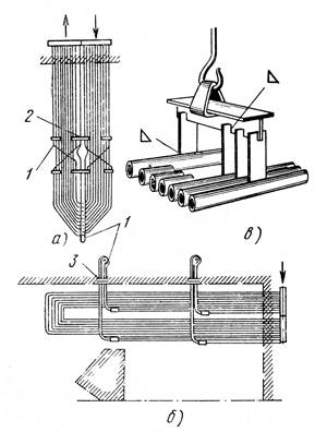 Рис. 2.17. Крепление вертикальной (а), горизонтальной (б) и потолочных труб (в)пароперегревателя (треугольником указаны места сварки): 1 – обвязочная труба, 2, 3 – детали крепления труб ширм Пароперегреватели имеют не только подвески и крепления, создающие жесткость, но и дистанционирующие устройства. Для конвективных пароперегревателей они изготовляются из жаропрочных сталей или чугуна, имеют вид гребенок, надеваемых на нижние петли труб нескольких соседних змеевиков, и предназначены для того, чтобы змеевики находились на определенном расстоянии друг от друга. Уменьшение расстояния между змеевиками вызывает быстрое шлакование и изменение условий их омывания топочными газами, что значительно снижает надежность работы. Ремонт подвесок, креплений и дистанционирующих устройств пароперегревателей заключается в их проверке и замене поломанных и сгоревших деталей. Одновременно регулировкой длины подвесок и установкой дистанционирующих деталей выравнивают змеевики. Змеевики водяных экономайзеров крепят на стойках различных конструкций, а также на подвесках из труб. Стойки 2 и подвески 4 (рис. 2.18, а – в)присоединяют к горизонтальным опорным балкам 3, охлаждаемым воздухом, или к находящимся в газоходе сборным камерам водяного экономайзера. Крепежные детали экономайзера работают в тяжелых условиях, поэтому его змеевики подвешивают на охлаждаемых водой трубах (рис. 2.18, г).