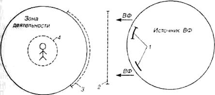 Рис. 0.8. Варианты использования экобиозащитной техники для снижения вредных воздействий: 1—устройства, входящие в состав источника воздействий; 2 — устройства, устанавливаемые между источником и зоной деятельности; 3— устройства для защиты зоны деятельности; 4— средства индивидуальной защиты человека