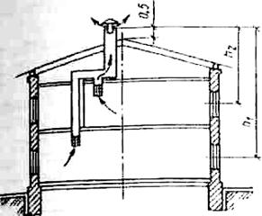 Рис. 1.6. Схема естественной канальной вытяжной вентиляции: h1 — нижний ярус окон; h2 — верхний ярус окон