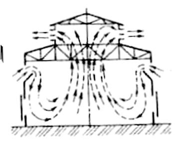 Аэрацией называется организованна естественная общеобменная вентиляция помещений в результате поступления удаления воздуха через открывающиеся фрамуги окон и фонарей. Воздухообмен помещении регулируют различной степенью открывания фрамуг (в зависимости от температуры наружного воздуха, скоро. сти и направления ветра). Как способ вентиляции аэрация нашла широкое применение в промышленных зданиях, характеризующихся технологическими процессами с большими тепловыделениями (прокатных цехах, литейных, кузнечных). Поступление наружного воздуха в цех в холодный период года организуют так, чтобы холодный воздух не попадал в рабочую зону. Для этого наружный воздух подают в помещение через проемы, расположенные не ниже 4,5 м от пола (рис. 1.8), в теплый период года приток наружного воздуха ориентируют через нижний ярус оконных проемов (А = 1,5...2 м). При расчете аэрации определяют требуемую площадь проходного сечения проемов и аэрационных фонарей для подачи и удаления необходимого количества воздуха. Исходными данными являются конструктивные размеры помещений, проемов и фонарей, величины теплопродукции в помещении, параметры наружного воздуха. Согласно СНиП 2.04.05—91 расчет рекомендуется выполнять на действие гравитационного давления. Ветровой напор надлежит учитывать только при решении вопросов защиты вентиляционных проемов от задувания. При расчете аэрации составляют материальный (по воздуху) и тепловой баланс помещения: