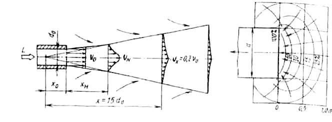 Существенное влияние на параметры воздушной среды в рабочей зоне оказывают правильная организация и устройство приточных и вытяжных систем. Воздухообмен, создаваемый в помещении вентиляционными устройствами, сопровождается циркуляцией воздушных масс в несколько раз больших объема подаваемого или удаляемого воздуха. Возникающая циркуляция является основной причиной распространения и перемешивания вредных выделений и создания в помещении разных по концентрации и температуре воздушных зон. Так, приточная струя, входя в помещение, вовлекает в движение окружающие массы воздуха, в результате чего масса струи в направлении движения будет возрастать, а скорость падать. При истечении из круглого отверстия (рис. 1.10) на расстоянии 15 диаметров от устья скорость струи составит 20 % от первоначальной скорости v0, а объем перемещающегося воздуха увеличится в 4,6 раза. Скорость затухания движения воздуха зависит от диаметра выпускного отверстия d0: чем больше d0, тем медленнее затухание. Если нужно быстрее погасить скорость приточных струй, подаваемый воздух должен быть разбит на большое число мелких струй. Существенное влияние на траекторию струи оказывает температура приточного воздуха: если температура приточной струи выше температуры воздуха помещения, то ось загибается вверх, если ниже, то вниз и при изотермическом течении она совпадает с осью приточного отверстия. К всасывающему отверстию (вытяжная вентиляция) воздух натекает со всех сторон, вследствие чего и падение скорости происходит весьма интенсивно (рис. 1.11). Так, скорость всасывания на расстоянии одного диаметра от отверстия круглой трубы равна 5 % vo.
