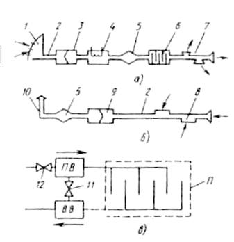 Циркуляция воздуха в помещении и соответственно концентрация примесей и распределение параметров микроклимата зависит не только от наличия приточных и вытяжных струй, но и от их взаимного расположения. Различают четыре основные схемы организации воздухообмена при общеобменной вентиляции: сверху—вверх (рис. 1.12, о); сверху —вверх (рис. 1.12, б); снизу —вверх (рис. 1.12, в); снизу — вниз (рис. 1.12, г). Кроме этих схем применяют комбинированные. Наиболее равномерное распределение воздуха достигается в том случае, когда приток равномерен по ширине помещения, а вытяжка сосредоточена. При организации воздухообмена в помещениях необходимо учитывать и физические свойства вредных паров и газов и в первую очередь их плотность. Если плотность газов ниже плотности воздуха, то удаление загрязненного воздуха происходит в верхней зоне, а подача свежего — непосредственно в рабочую зону. При выделении газов с плотностью большей плотности воздуха из нижней части помещения Удаляется 60...70 % и из верхней части 30...40 % загрязненного воздуха. В помещениях со значительными выделениями влаги вытяжка влажного воздуха осуществляется в верхней зоне, а подача свежего в количестве 60 % — в рабочую зону и 40 % -— в верхнюю зону. По способу подачи и удаления воздуха различают четыре схемы jбщеобменной вентиляции (рис. 1.13): приточная, вытяжная, приточно-вытяжная и системы с рециркуляцией. По приточной системе воздух сдается в помещение после подготовки его в приточной камере. В мещении при этом создается избыточное давление, за счет которого воздух уходит наружу через окна, двери или в другие помещения. риточную систему применяют для вентиляции помещений, в которые елательно попадание загрязненного воздуха из соседних помещений или холодного воздуха извне. Установки приточной вентиляции (рис. 1.13, а) обычно состоят из дующих элементов: воздухозаборного устройства 1 для забора чис того воздуха; воздуховодов 2, по которым воздух подается в помещение, фильтров 3 для очистки воздуха от пыли, калориферов 4, в которых подогревается холодный наружный воздух; побудителя движения 5, увлажнителя-осушителя б, приточных отверстий или насадков 7, через которые воздух распределяется по помещению. Воздух из помещения удаляется через неплотности ограждающих конструкций.