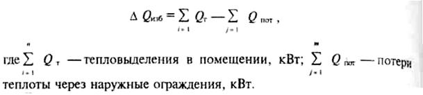 где ΔQизб—избытки явной теплоты всего помещения, кВт; В летнее время вся теплота, которая поступает в помещещ* является суммой теплоизбытков. В холодный период года часть теп ловыделений в помещении расходуется на компенсацию теплопотерь