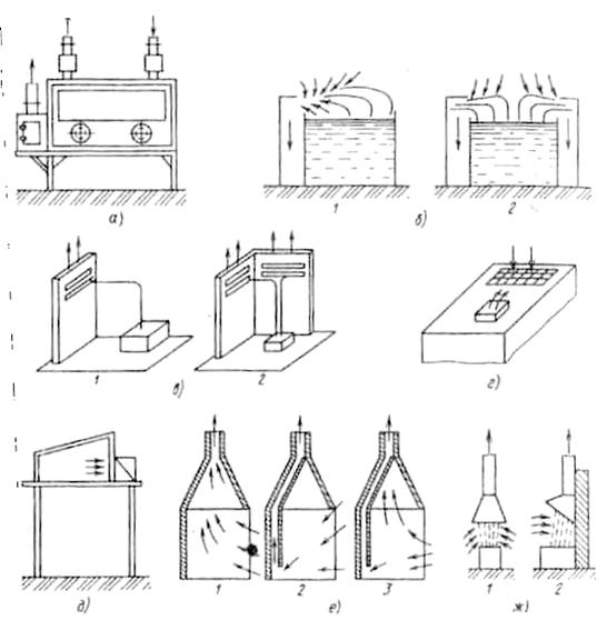 Рис. 1.14. Устройства местной вентиляции: а — укрытие-бокс; 6 — бортовые отсосы (1 — однобортовой; 2 —двухбортовой); в — боковые отсосы (1 – односторонний, 2 – угловой); г – отсос от рабочих столов; д - отсос витражного типа; е – вытяжные шкафы (1 – с верхним отсосом, 2 – с нижним отсосом, 3 – с комбинированным отсосом); ж — вытяжные зонты (/ — прямой; 2 — наклонный)