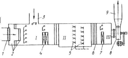 Рис. 1.15. Схема кондиционера: /—заборный воздуховод; 2— фильтр; 3— соединительный воздуховод; 4— калориферы первой и второй ступени подогрева; 5— форсунки воздухоочистки; 6— переходник-каплеуловитель; 7~-калориферы второй ступени; 8 — вентилятор; 9 — отводной воздуховод