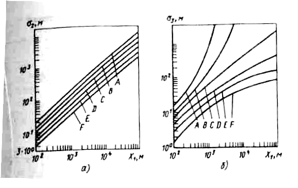 Рис. 4.32. Стандартные отклонения в зависимости от расстояния от источника и категории устойчивости погоды: a—для поперечного и горизонтального; б— для вертикального распределений концентрации