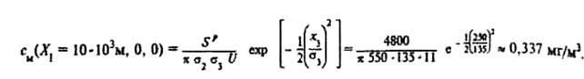 Определить максимальную концентрацию на расстоянии 10 км от городского стационарного источника производительностью 4800 г/с, если эффективная высота выброса 250 м, скорость ветра 3 м/с на высоте 10 м, погодные условия —сплошной обдачный покров. Выбрав оси, как показано на рис. 4.33, воспользуемся формулой (III) табл. 4.18. Выброс происходит в точке с координатами x1 = 0, x2 = 0, х3 = - 250 м. Максимальная концентрация сМ на расстоянии Х1 = 10×103 м достигается на поверхности земли (Х3 = 0) по оси струи (Х2 = 0). Для условий города U= 3(250/10)0,4 = 11 м/с. Время t = Х1/U = 900 с, что будем считать близким к периоду времени, для которого справедлива формула. Из табл. 4.19 находим, что сплошной облачный покров соответствует категории D. По рис. 4.32 определяем s2(Х1 = 10×103 м) = 550 м, s3(Х1 = 10×103 м) = 135 м. Откуда
