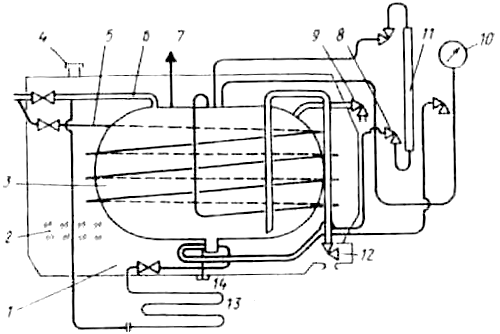 Рис. 5.3. Криогенный резервуар: / —кожух; 2— изоляция; 3— сосуд для криогенной жидкости; 4— предохранительная мембрана; 5— змеевик; 6— дренажная труба; 7—предохранительный клапан; 8— вентиль; 9— заправочный вентиль; 10— манометр; 11— указатель уровня; 12— вентиль для слива; 13— испаритель; 14— пробка для продувки отстойника