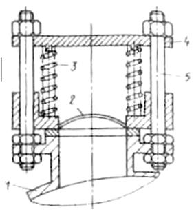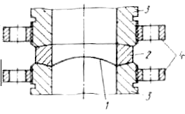 Рис. 5.4. Линзовый зажим разрывной мембраны: 1 — мембрана; 2 — коническая шайба; 3 — торцы сбросной магистрали; 4— соединительные фланцы