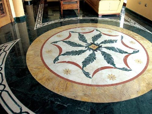 д) Ковровая мозаика Дает возможность использовать отходы камня. В небольшую разборную форму укладывают куски плит лицевой стороной вниз, закладывают арматуру и заливают цементным раствором. После схватывания раствора форму раскрывают, плиту шлифуют или полируют. Укладывают такую плиту на пол на раствор.