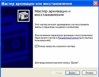Запуск программы осуществляется: Пуск – программы – стандартные – служебные – архивация данных. Откроется мастер архивации и восстановления в обычном режиме. Из этого режима можно перейти в расширенный режим для работы с мастером архивации, мастером восстановления и мастером аварийного восстановления ОС.