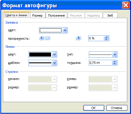 Форматирование надписей, картинок и рисунков Диалоговое окно формат. Диалоговое окно формат предполагает наиболее полные возможности для форматирования графических объектов. Для того чтобы активизировать окно диалога Формат, необходимо выполнить следующие действия: · Выделить объект, щелкнув на нем. Чтобы выделить объект, располагающий позади текста, нужно сначала щелкнуть на кнопке Выбор объектов панели инструментов Рисование · Выбрать из меню Формат команду Автофигура, Надпись, Рисунок, Объект WordArt. Название команды зависит от типа выделенного объекта. Откроется диалоговое окно Формат. Название окна будет соответствовать типу выделенного объекта.