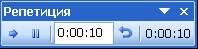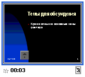 Настройка времени показа слайда При смене слайдов по времени требуется задать временной интервал показа каждого слайда. Для этого выбирают команду Показ слайдов / Настройка времени. Начнется представление презентации. Во время представления презентации в левом верхнем углу экрана появляется счетчик времени с кнопками, с помощью которого управляется и контролируется время показа слайда. После завершения представления презентации редактор отображает презентацию в режиме сортировщика, под каждым слайдом будет указано время его показа.