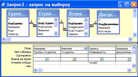 В окне «Запрос: запрос на выборку» с помощью инструментов формируем query: · Выбирать таблицу – источник, из которой производится выборка записей. · Переместить имена полей с источника в Бланк запроса. Например, из таблицы Группы студентов отбуксировать поле Название в первое поле Бланка запросов, из таблицы Студенты отбуксировать поле Фамилии во второе поле Бланка запросов, а из таблицы Успеваемость отбуксировать поле Оценка в третье поле и из таблицы Дисциплины отбуксировать поле Название в четвертое поле Бланка запросов. · Задать принцип сортировки. Курсор мыши переместить в строку Сортировка для любого поля, появится кнопка открытия списка режимов сортировки: по возрастанию и по убыванию. Например, установить в поле Фамилия режим сортировки – по возрастанию. · В строке вывод на экран автоматически устанавливается флажок просмотра найденной информации в поле. · В строке "Условия" отбора и строке "Или" необходимо ввести условия ограниченного поиска – критерии поиска. Например, в поле Оценка ввести - "отл/A", т.е. отображать все фамилии студентов, которые получили оценки отл/A. · После завершения формирования запроса закрыть окно Запрос на выборку. Откроется окно диалога Сохранить – ответить Да (ввести имя созданного запроса, например, Образец запроса в режиме Конструктор) и щелкнуть ОК и вернуться в окно базы данных.