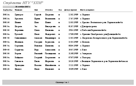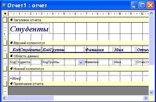 · В разделе Заголовок отчета выделить надпись Студенты. · Поместите указатель мыши справа от слова Студенты, так чтобы указатель принял форму вертикальной черты (курсора ввода), и щелкните в этой позиции. · Введите НТУ «ХПИ» и нажмите Enter. Форматирование: