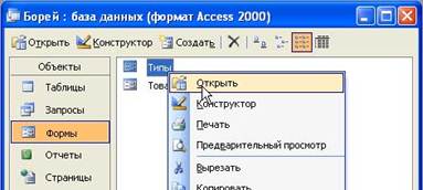 КЗ№15. (интерактивный контроль) Открыть форму «Типы», используя контекстное меню. Подсказка: