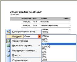 КЗ№16. (интерактивный контроль) Откройте отчет «Итоги продаж по объему» двойным щелчком (2ЛКМ). Используя контекстное меню, установите масштаб отображения отчета 150%. Подсказка: Масштабирование