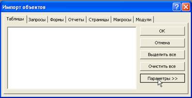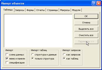 КЗ№34. (интерактивный контроль) (На экране окно диалога «Импорт объектов» с отображением параметров) В окне диалога «Импорт объектов» настроить параметры на импорт только структуры таблиц, пользовательских меню и панелей, а также запросов как таблиц. Подсказка: